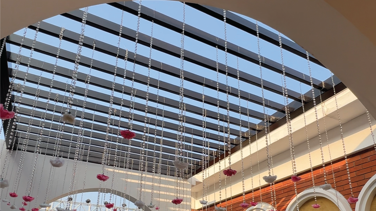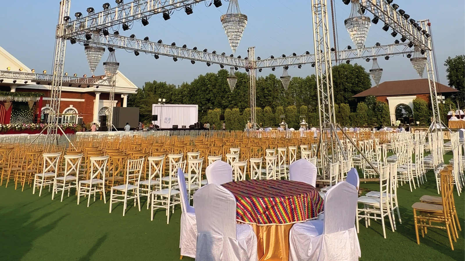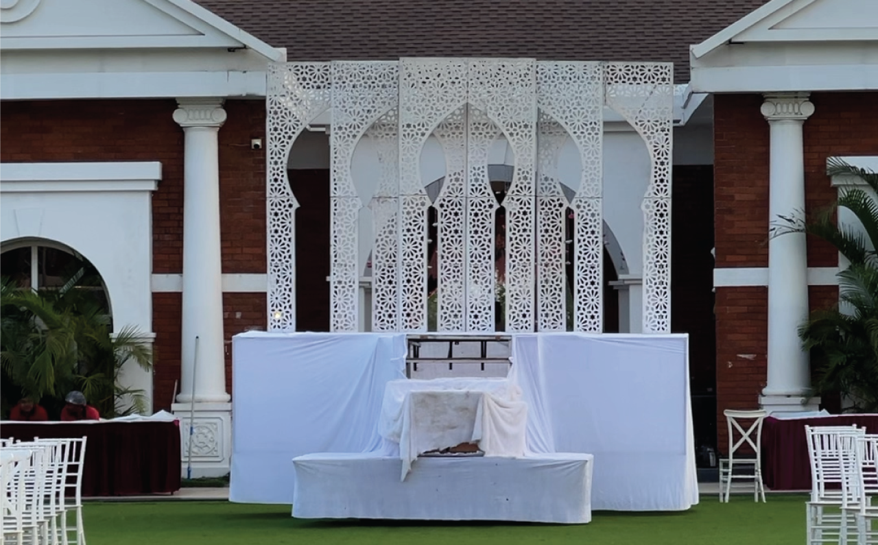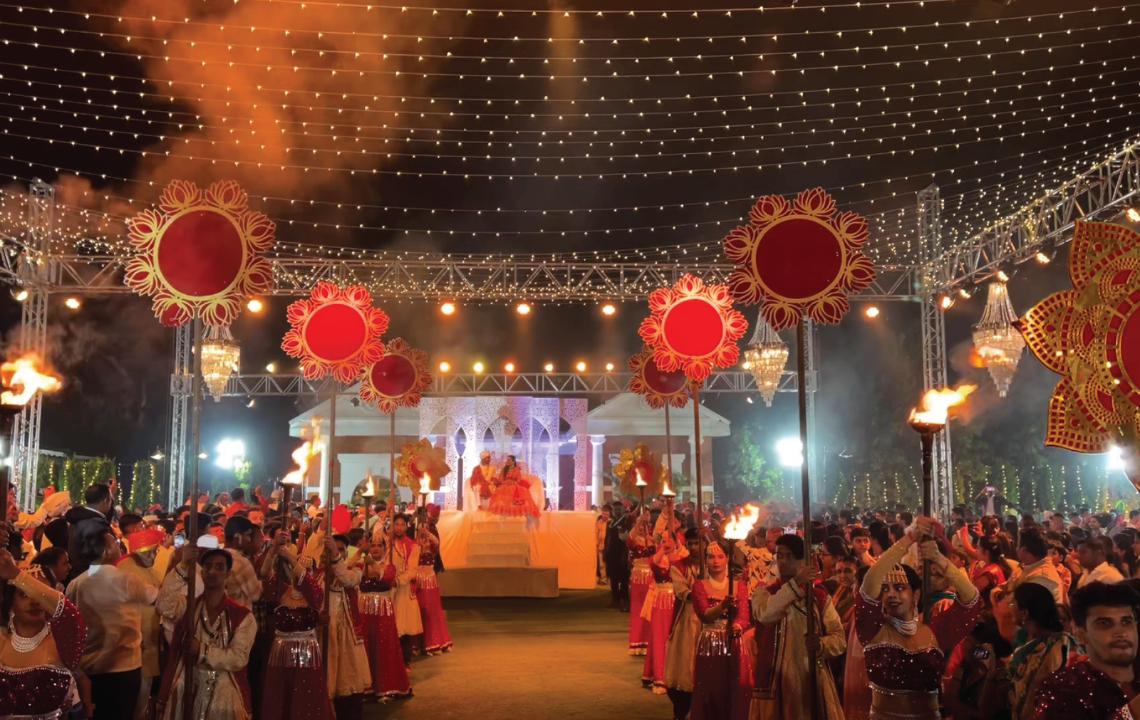 Guests walked into a world where every corner glowed — from cascading string lights that painted the sky, to statement backdrops that turned photographs into timeless portraits. The mandap, a masterpiece in florals and symmetry, stood as both a sacred space and a visual showstopper, blending tradition with dramatic scale.