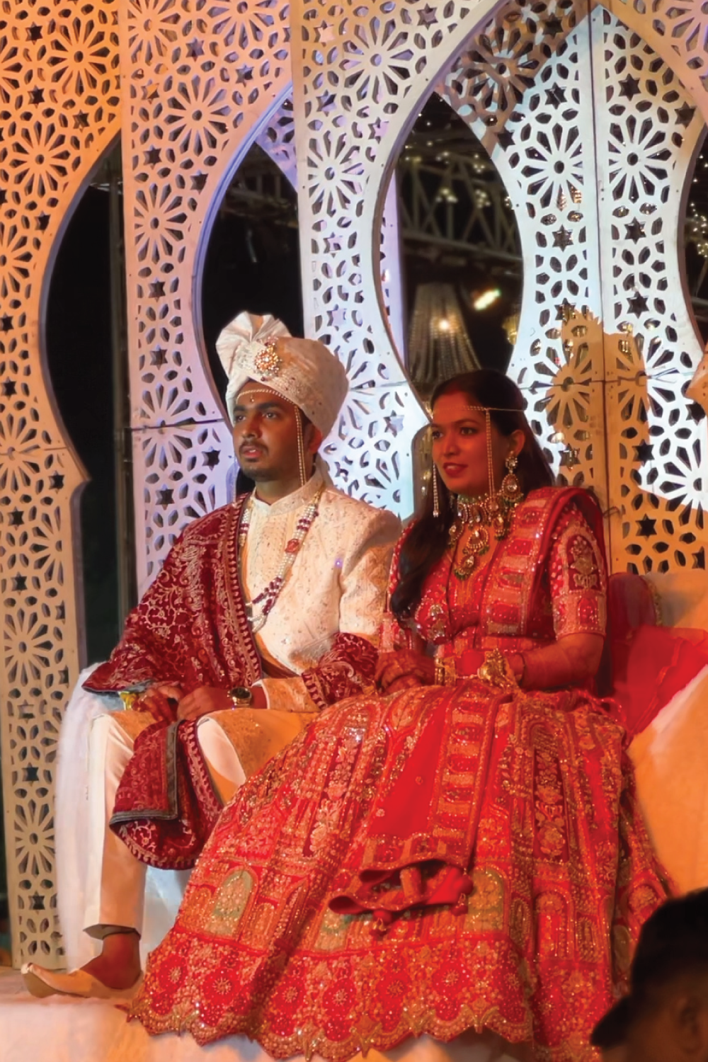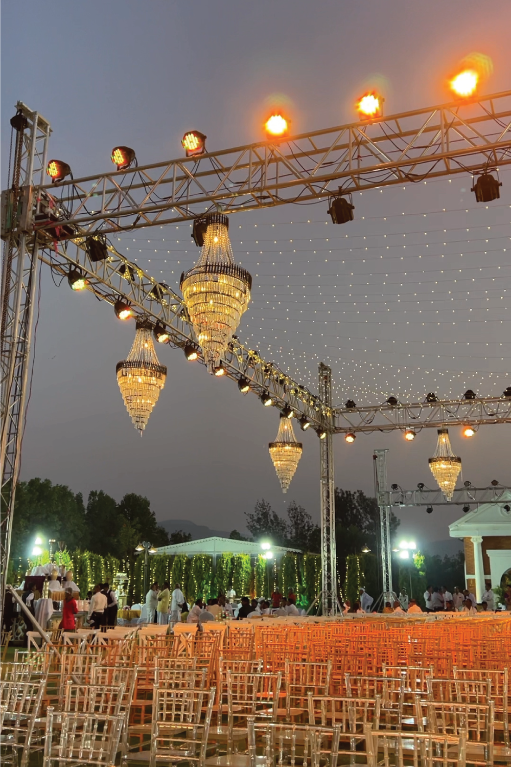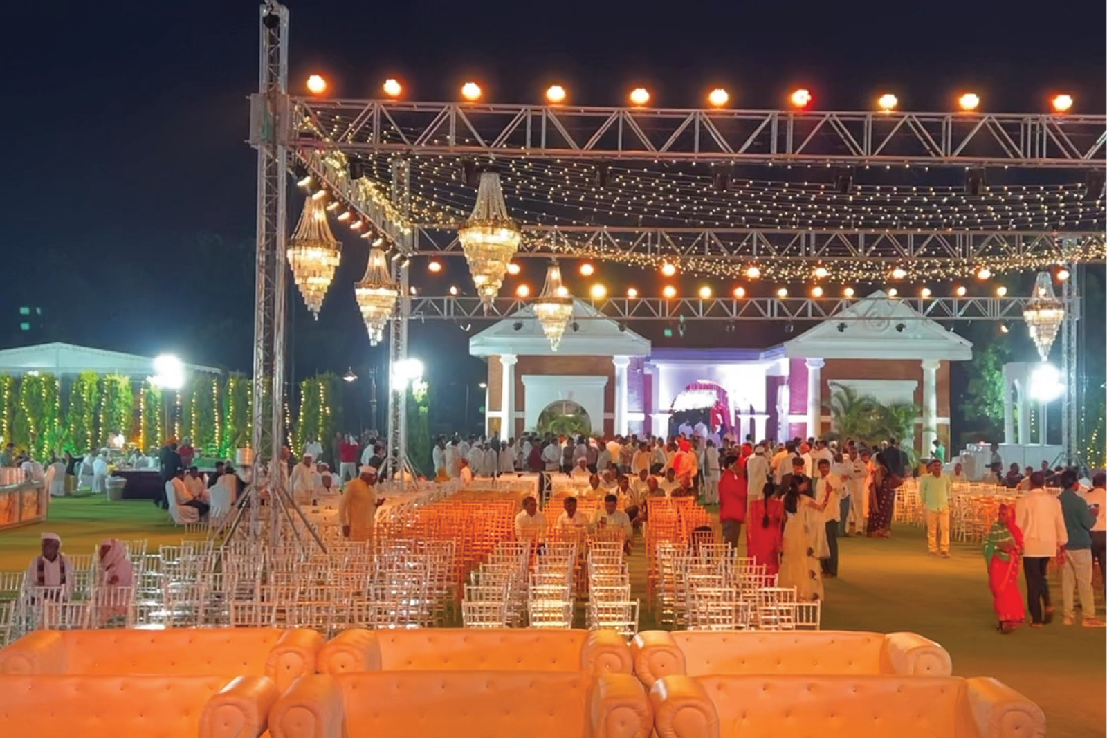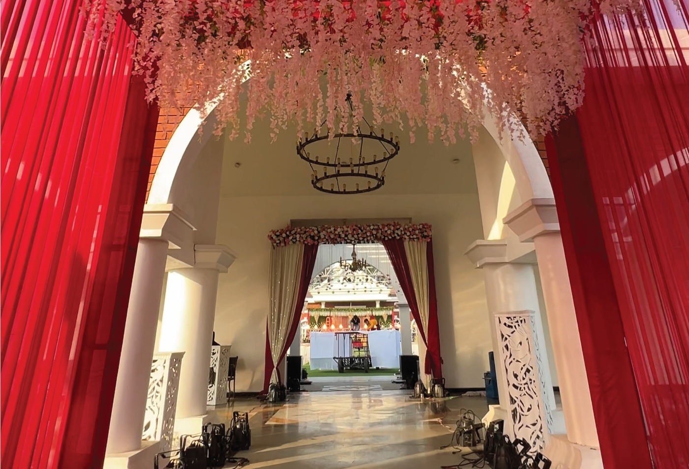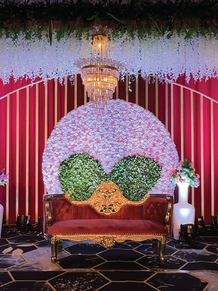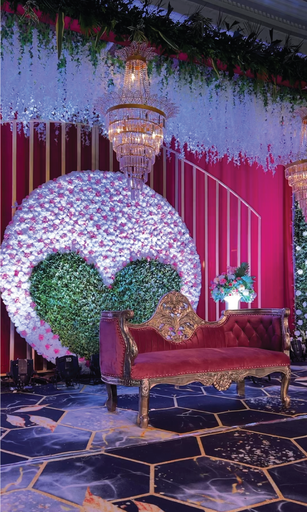 Guests walked into a world where every corner glowed — from cascading string lights that painted the sky, to statement backdrops that turned photographs into timeless portraits. The mandap, a masterpiece in florals and symmetry, stood as both a sacred space and a visual showstopper, blending tradition with dramatic scale.